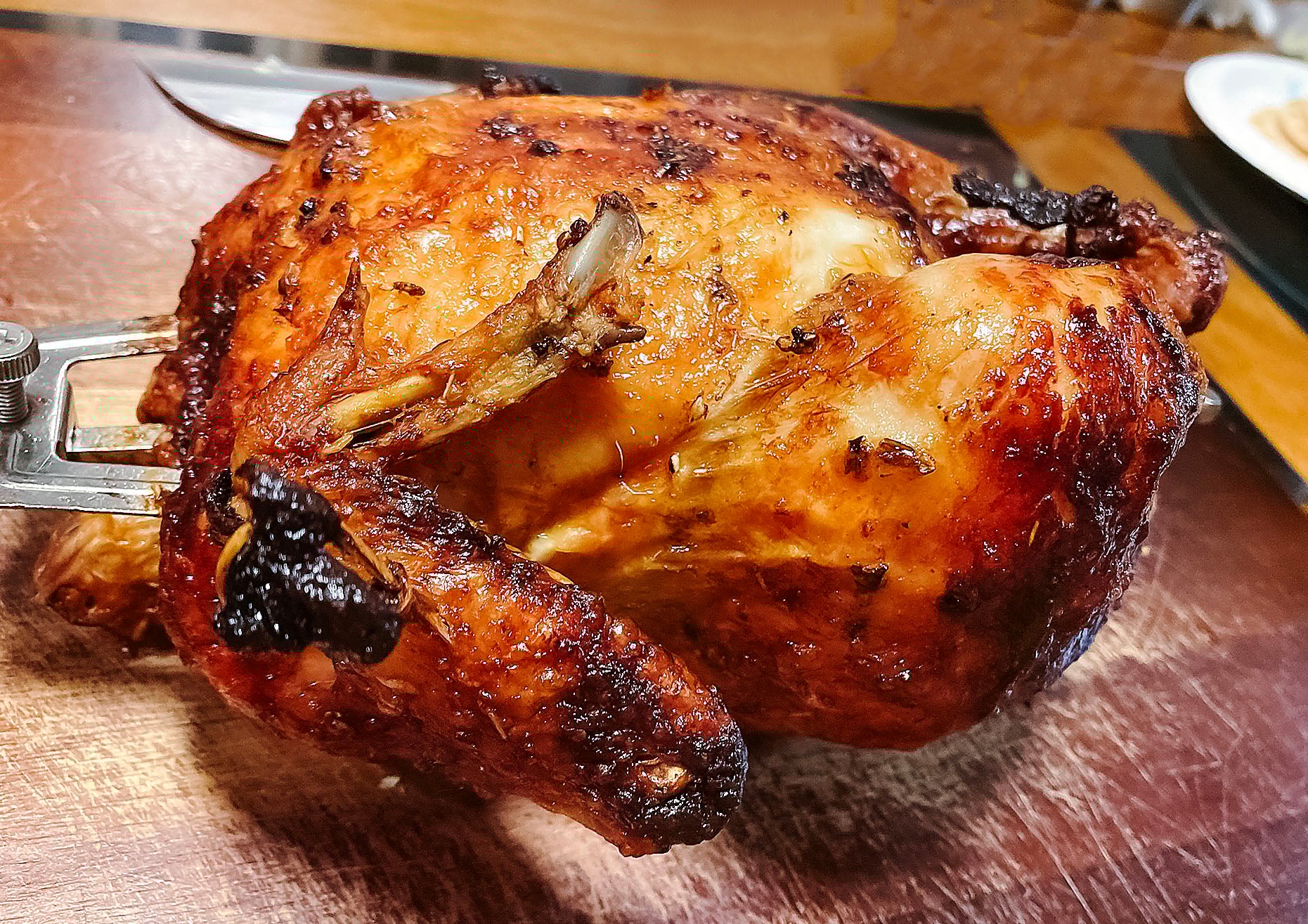 - Secure the chicken tightly onto the spit (loose chicken = chaos)