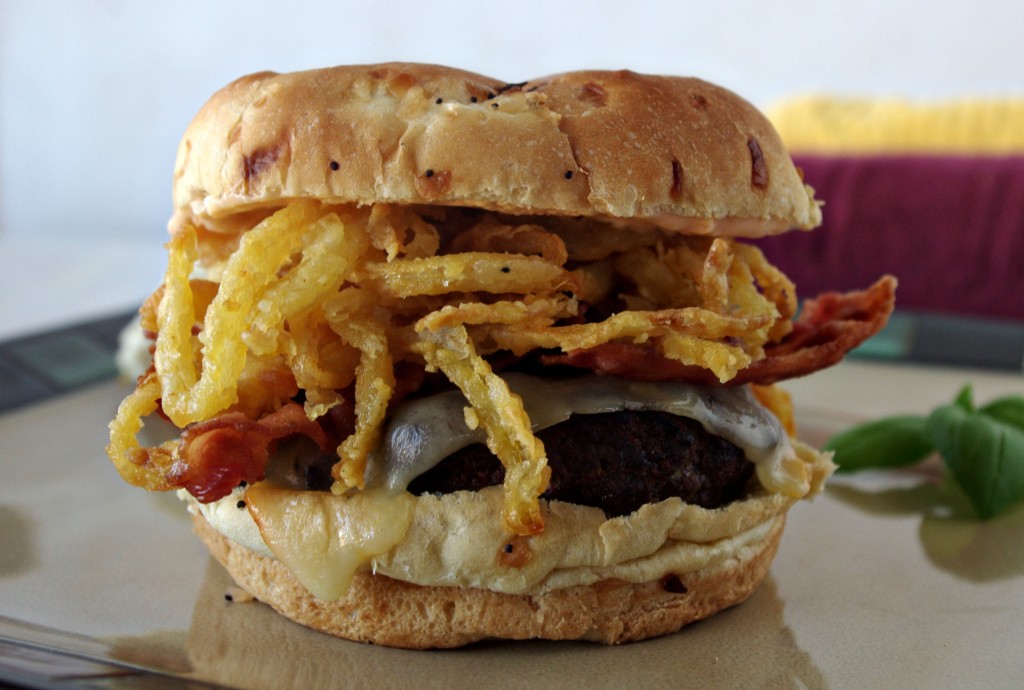 Bacon Burger with Muenster, Onion Strings and Buffalo Mayo
