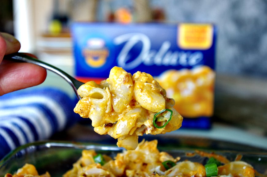 This awesome one dish dinner is Kraft’s Deluxe Macaroni and Cheese, combined with chopped chicken and buffalo sauce and topped with even more cheese.