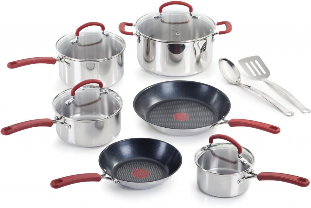 A set of T-fal Stainless Steel with Thermo-Spot Heat Indicator Dishwasher Safe 12-Piece Cookware Set. It features non-stick, durable, scratch-resistant stainless steel material. It’s also metal utensil and dishwasher safe and oven safe up to 350 degrees. Oh, and a limited lifetime warranty.