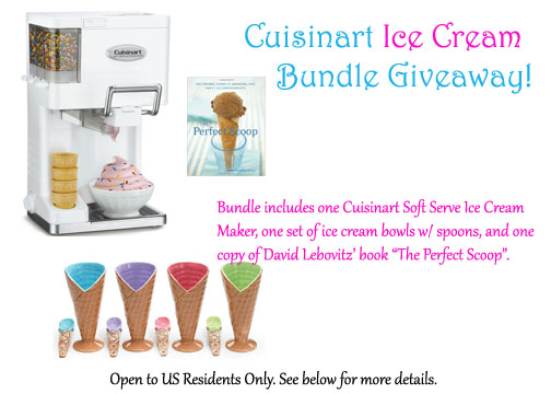 I’ve teamed up with a group of fantastic bloggers to offer one reader the opportunity to win this bundle, which includes (1) Cuisinart Soft Serve Ice Cream Maker, (1) set of colorful ice cream bowls with spoons and (1) copy of David Lebovitz’s book “The Perfect Scoop“.