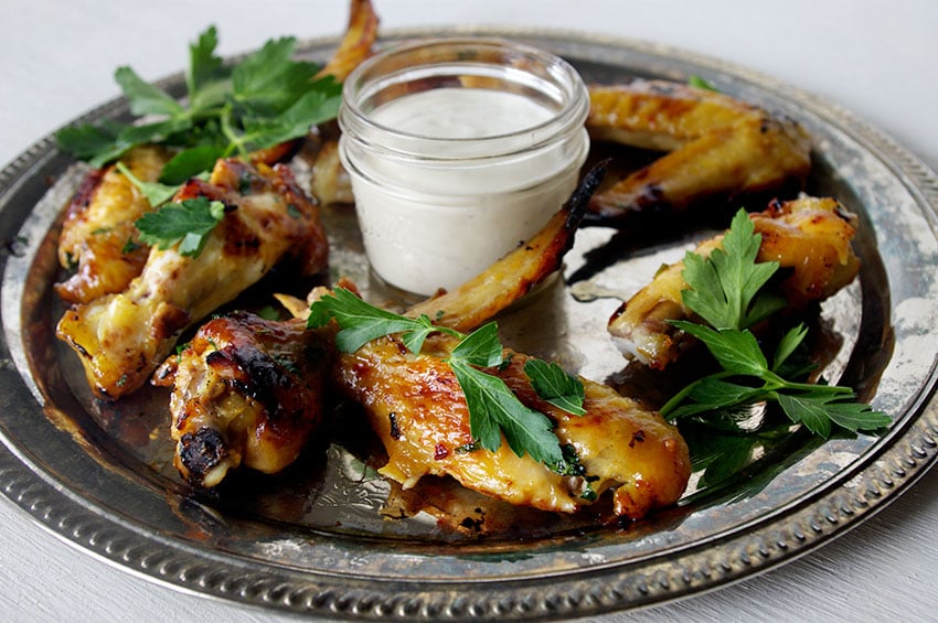 These wings are baked until crispy, then brushed with a sweet and spicy glaze. I also made a cool dip to counter the Sriracha. Feel free to adjust the amount of Sriracha in the glaze mixture to suit your heat tolerance. The amount I used is just enough to give it a little kick, but not too hot.