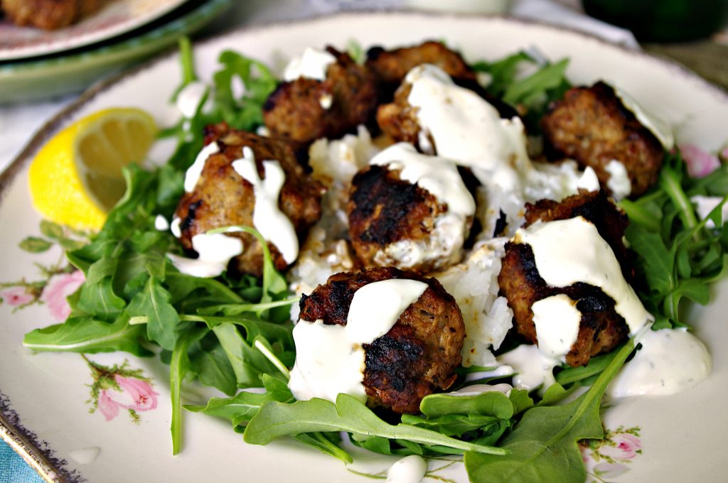 Serve Kafta over rice, arugula and drizzled with tzaziki.