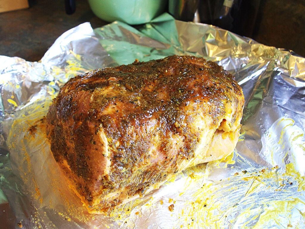 So, along with slathering the meat with mustard (a couple of times), I also cover it with a dry rub that makes the outside nice and dark and taste damn good.