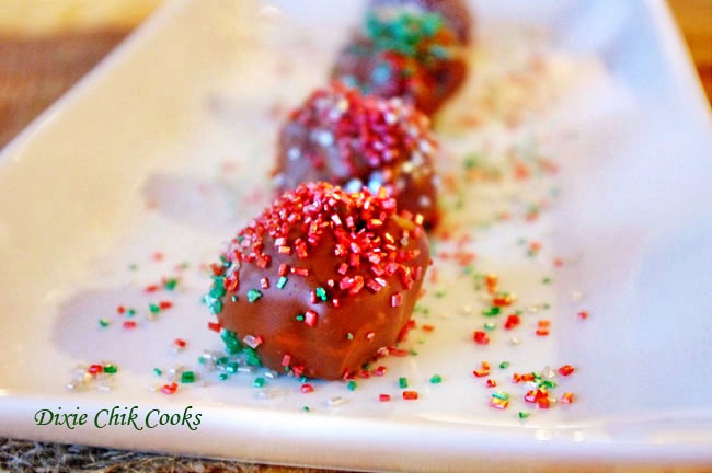 - Take about half of the truffles out of the fridge, dip in melted chocolate, decorate with sprinkles and refrigerate until firm; about an hour. Do the same with the white chocolate chips and remaining truffles.