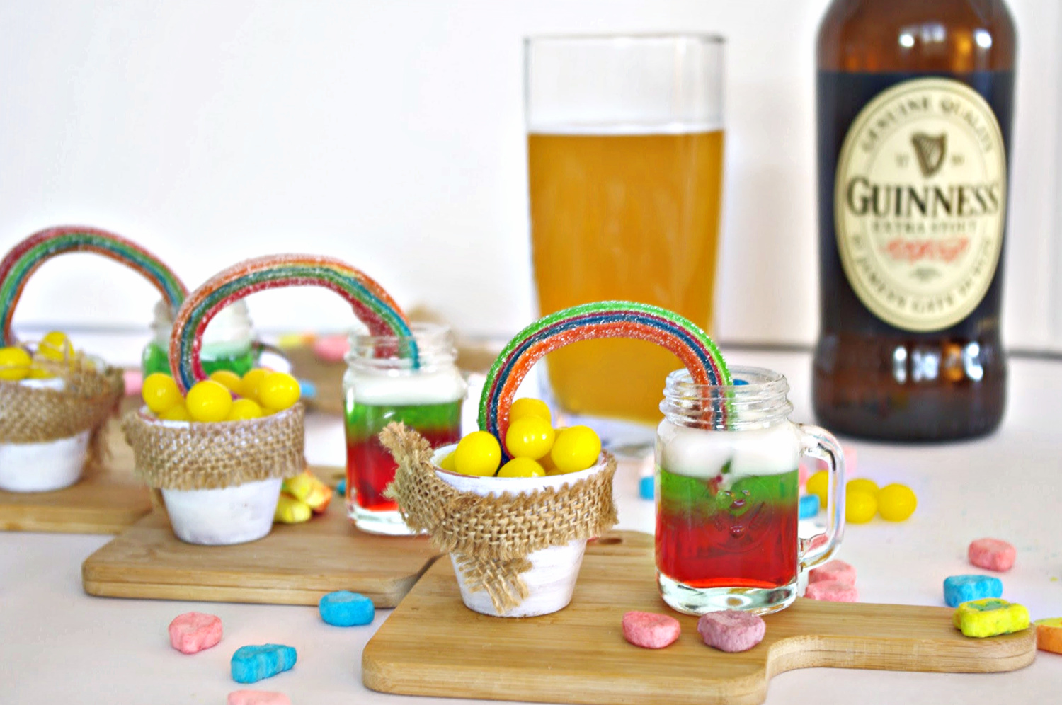 The rainbows are Airhead sour candy strips that I easily curved. The pots of gold are tiny little pots that I found at Hobby Lobby for very cheap, and I cut burlap to wrap around the top of the pots. You could use the plastic shot cups; those would work just as well!