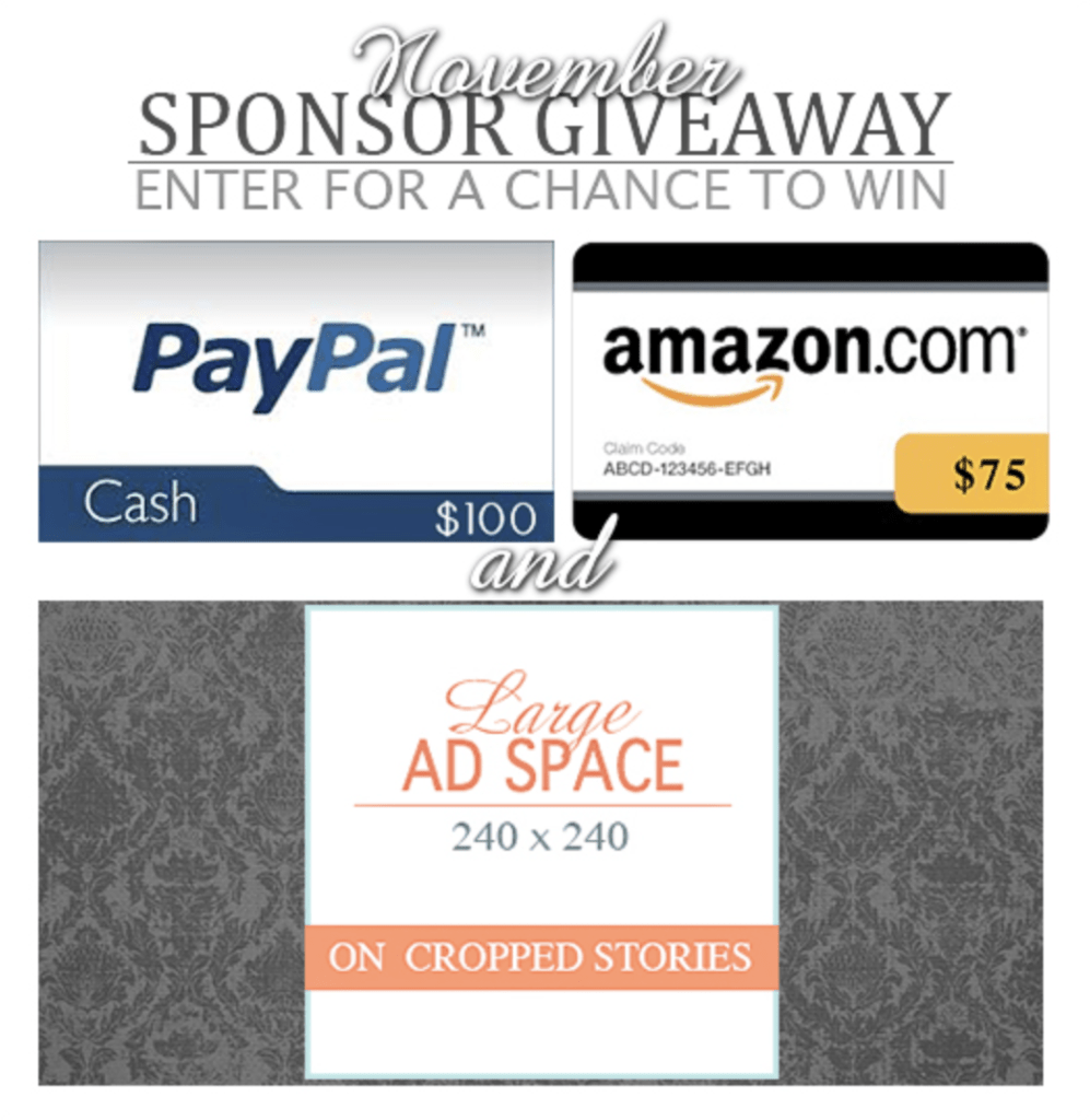 For those interested in FREE prizes; it’s your lucky day! Our giveaway is still up, running, and just waiting for you to enter for a chance to win $100 in PayPal cash, a $75 Amazon Gift Card, and free ad space on Cropped Stories! Only it closes in less than 4 days, so don’t delay! And if you wanted to, feel free tell your friends! I’m just sayin’!