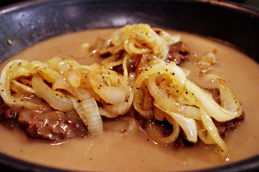 Put the steaks back in the pan with gravy, and top with the caramelized onions.