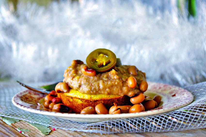 I had to take it further, of course. I added salsa verde to the refried peas. That taste is unbelievable, not to mention combined with the jalapeño cheddar cornbread.
