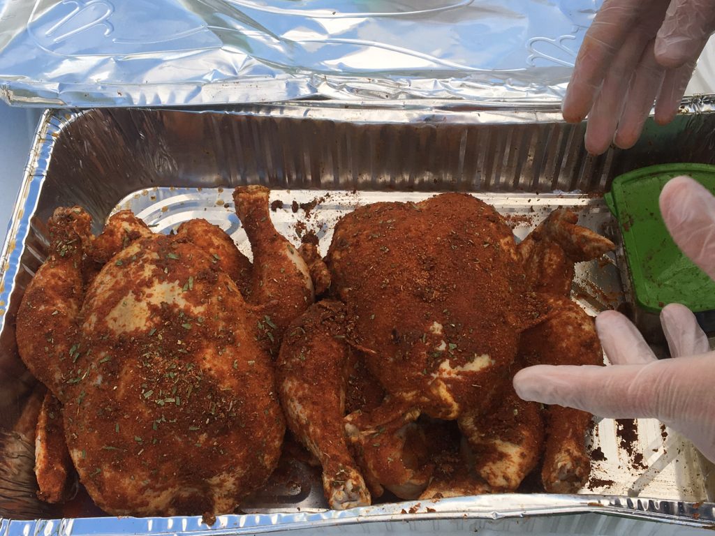 - Rub chickens (place a beer can into each cavity of the chickens and stabilize on grill) and lamb with rub and smoke over indirect heat at 275-350 for 3-4 hours. <---Use your judgment here; I'm no smoking expert.