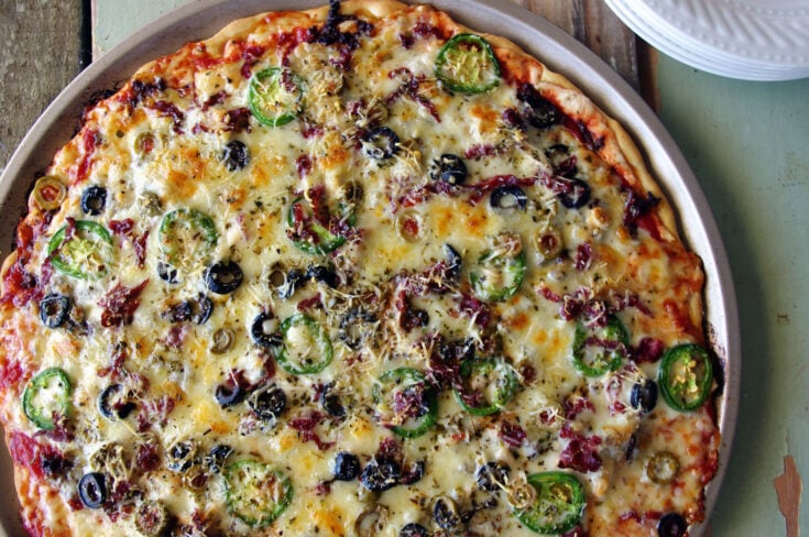 Classic Italian Puttanesca sauce is all about punchy flavors – garlic, olives, capers, and anchovies – the kind of combination that doesn’t whisper; it yells deliciously. I took those bold, briny vibes and turned them into a pizza that’s equal parts salty, spicy, and unapologetically extra. Think chicken, ground beef, thin pastrami, and sliced jalapeños hanging out with buttery Castelvetrano and black olives over a garlicky, anchovy-spiked tomato base. It’s basically Puttanesca gone rogue… and it’s glorious.